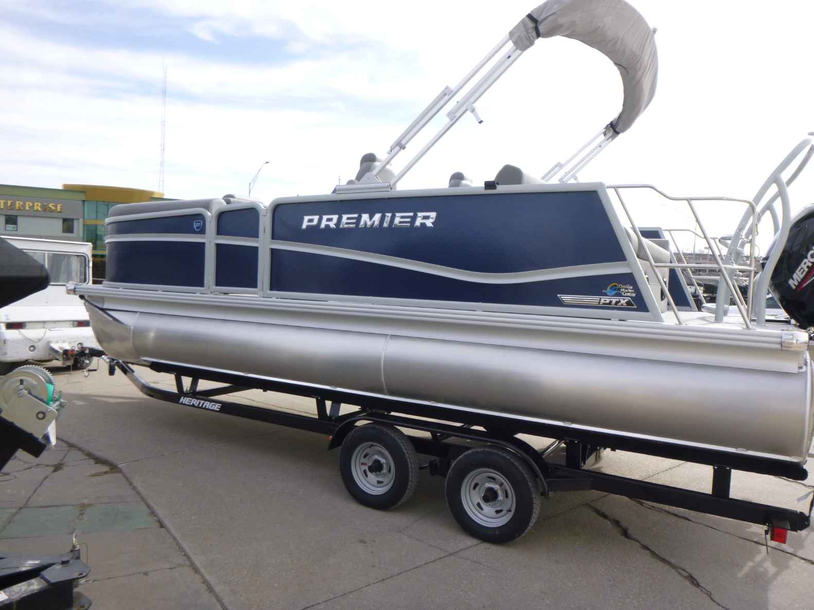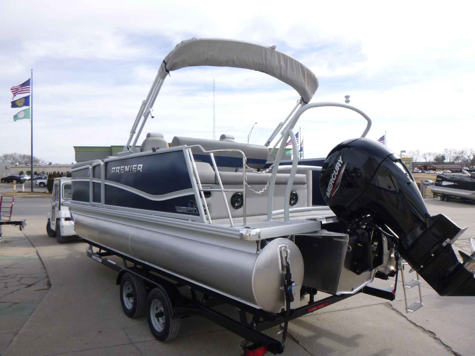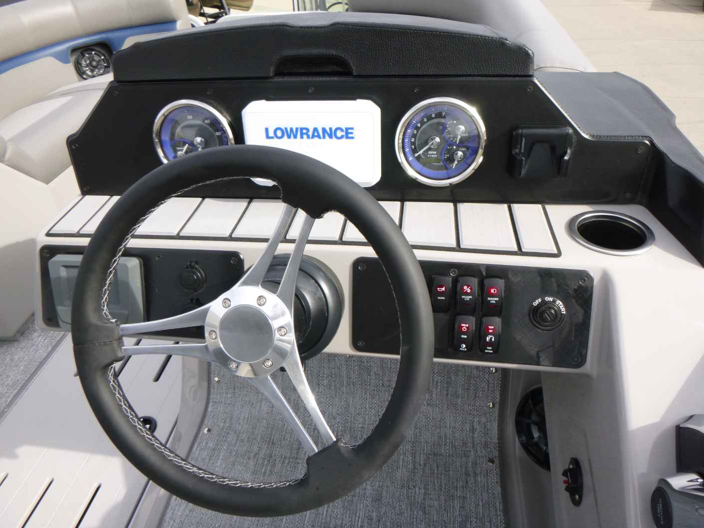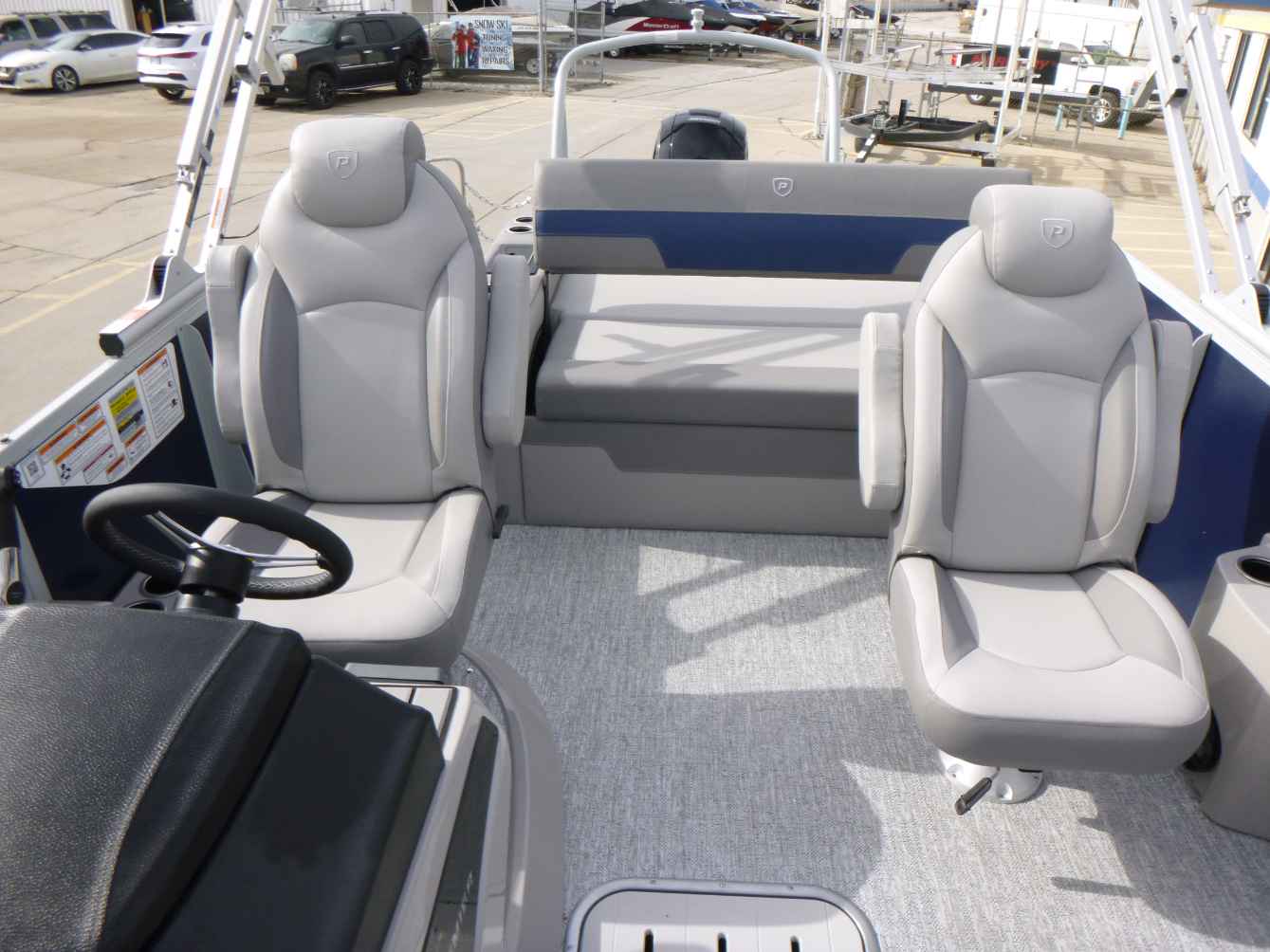 Featuring a Mercury 150XL engine, PTX28 model, elegant Nautical Blue exterior, Moonstone Rails, and Mountain Gray interior. Equipped with a Ski Tow Bar, Lowrance Eagle 5 Fish Finder, Wetsounds Stereo, Power Bimini, and comes with a T/A Trailer.